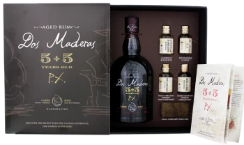 Dos Maderas PX 5 + 5 Tasting Set 0.788L 38.8% Country of origin: Caribbean Islands Content: 0.788 liters Alcohol percentage: 38.8% Dos Maderas PX 5 + 5 comes from the Caribbean from the producer Dos Maderas. The Dos Maderas PX 5 + 5 Tasting Set is a beautiful rum packed in a special box and consists of: – a beautiful bottle of PX 5 + 5 – 4 miniature bottles: – Caribean blend rum – Dos Maderas 5 + 3 rum – Palo Cortado Sherry Dos Cortados – Pedro Ximenez Sherry Don Guido The rum has matured for 5 years in white barrels, after transport to Europe another 5 years in sherry barrels. Aroma: cake, popcorn and almonds. Taste: sherry-like, caramel, honey, sweet and fruity. Finish: ultra smooth and long lasting. Dos Maderas PX 5 + 5 Tasting Set is now for a good price for sale online at Luxurious Drinks !.